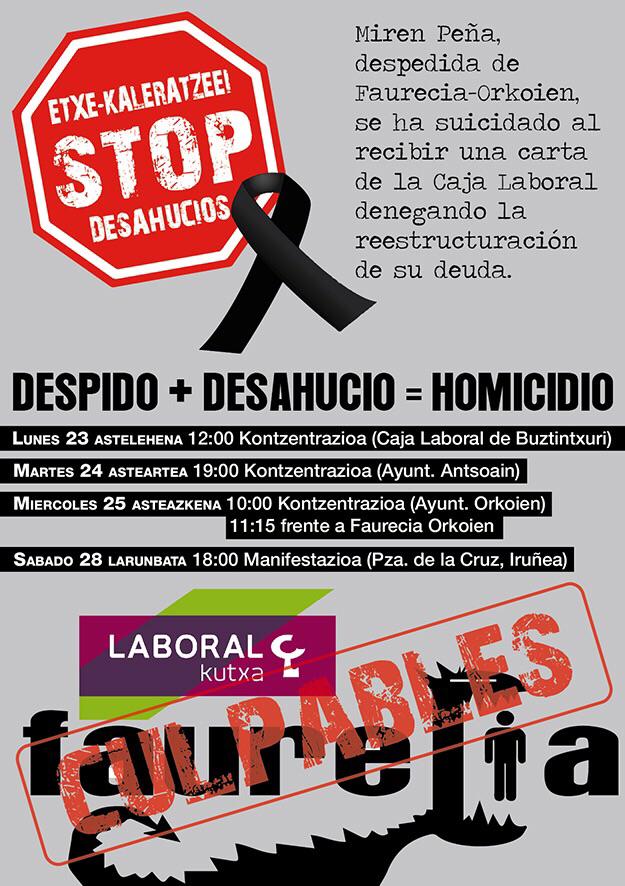 Una mujer de Antsoain, que había sido despedida por Faurecia, se ha suicidado tras la negativa de la Caja Laboral de reestructurar su hipoteca. Una vez es evidente la crueldad del sistema capitalista, que